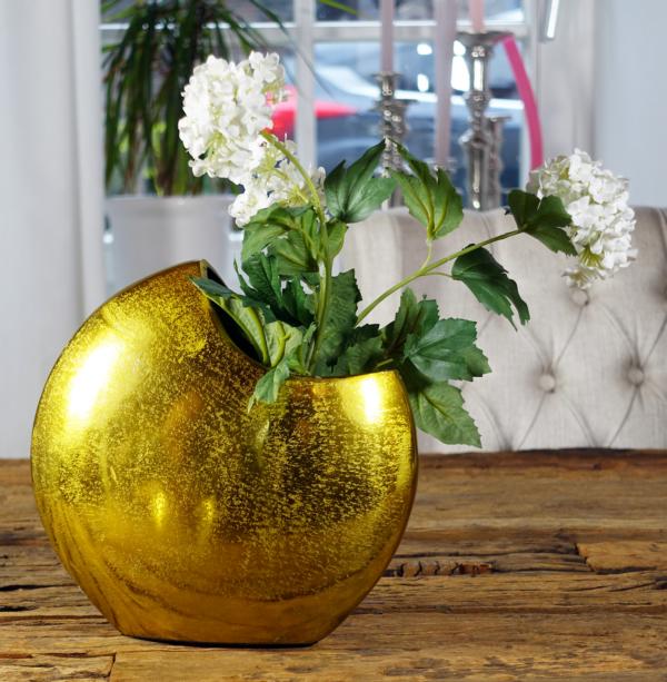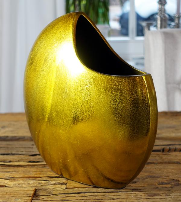 Diese bauchige Vase mit einer Größe von 28 cm hat ein exklusives und formschönes Design, das sofort positiv ins Auge fällt. Die wunderschöne goldene Tischvase wurde mit der Hand gefertigt und aus hochwertigem Aluminium hergestellt. Diese Blumenvase verleiht nahezu jedem Einrichtungs- und Wohlstil ein einzigartiges Flair. Durch das einzigartige Design gibt die Vase dem Raum eine besonders individuelle und stilvolle Note.