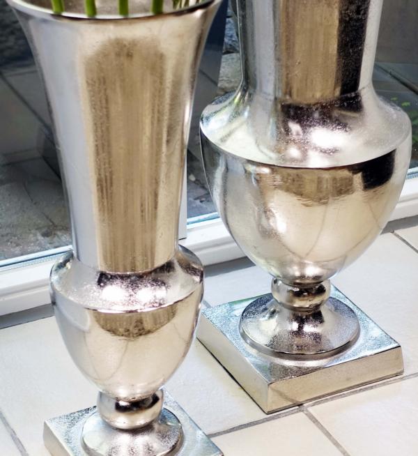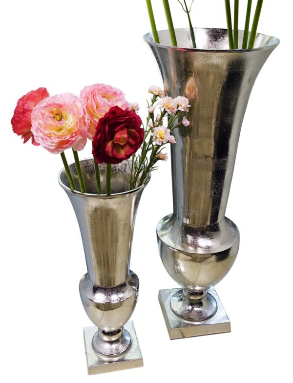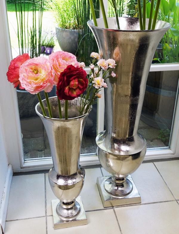 Bodenvase Silber aus Aluminium in 2 verschiedenen Größen. Die Deko-Vase besteht aus massivem Aluminium und wurde zu 100 % von Hand gefertigt. Durch das hohe Eigengewicht stehen beide Vasen sehr stabil auf dem jeweiligen Untergrund. Ob einzeln oder im Duo, die Vase wirkt als wahres Deko-Highlight. Ob mit Kunstblumen, oder ganz ohne Blumen dekoriert, die Vase ist jederzeit ein Blickfang. Sie macht sich besonders gut im Eingangsbereich, dem Wohnzimmer, oder auch dem Büro. Auch in der Gastronomie kann sie sehr gut in ein elegantes Ambiente eingebunden werden. In einer angesagten Bar, einem schicken Restaurant, oder einem hochklassigen Hotel, die silberfarbene Vase wertet jeden Raum auf. Gerade das Material Aluminium (Metall) macht diese Vase sehr langlebig. Die Farbe Silber ist absolut zeitlos, so dass du dich auch in vielen Jahren noch an deiner Vase erfreuen kannst. Schön ist auch, dass diese Vase mit nahezu jedem Einrichtungsstil kombiniert werden kann. Ob Landhaus-Stil, moderne Einrichtung, oder eher klassisch, diese Vase lässt sich in jeden Wohnstil wunderbar einbinden. Die Oberfläche der Vase ist in einer schönen "Raw"-Optik gehalten. Das heißt, dass die Vase nach dem Guß nicht mehr poliert wurde. Die Vase sieht so wesentlich lebendiger aus und behält seine natürliche Oberflächenstruktur mit Unebenheiten. Diese Unebenheiten sind absolut gewollt und machen den Artikel erst einzigartig. Die XXL Vase ist auch wesentlich pflegeleichter, da sie nicht poliert werden muss.