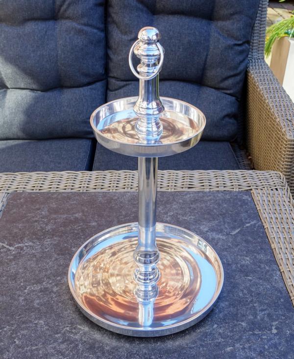 Neben einer klassischen einstöckigen Etagere haben wir auch eine klassische Zweistöckige. Auch diese Etagere wurde handgefertigt und hochwertig aus Aluminium verarbeitet. Sie ist dadurch ein Unikat und überzeugt in silberfarbener Optik.
