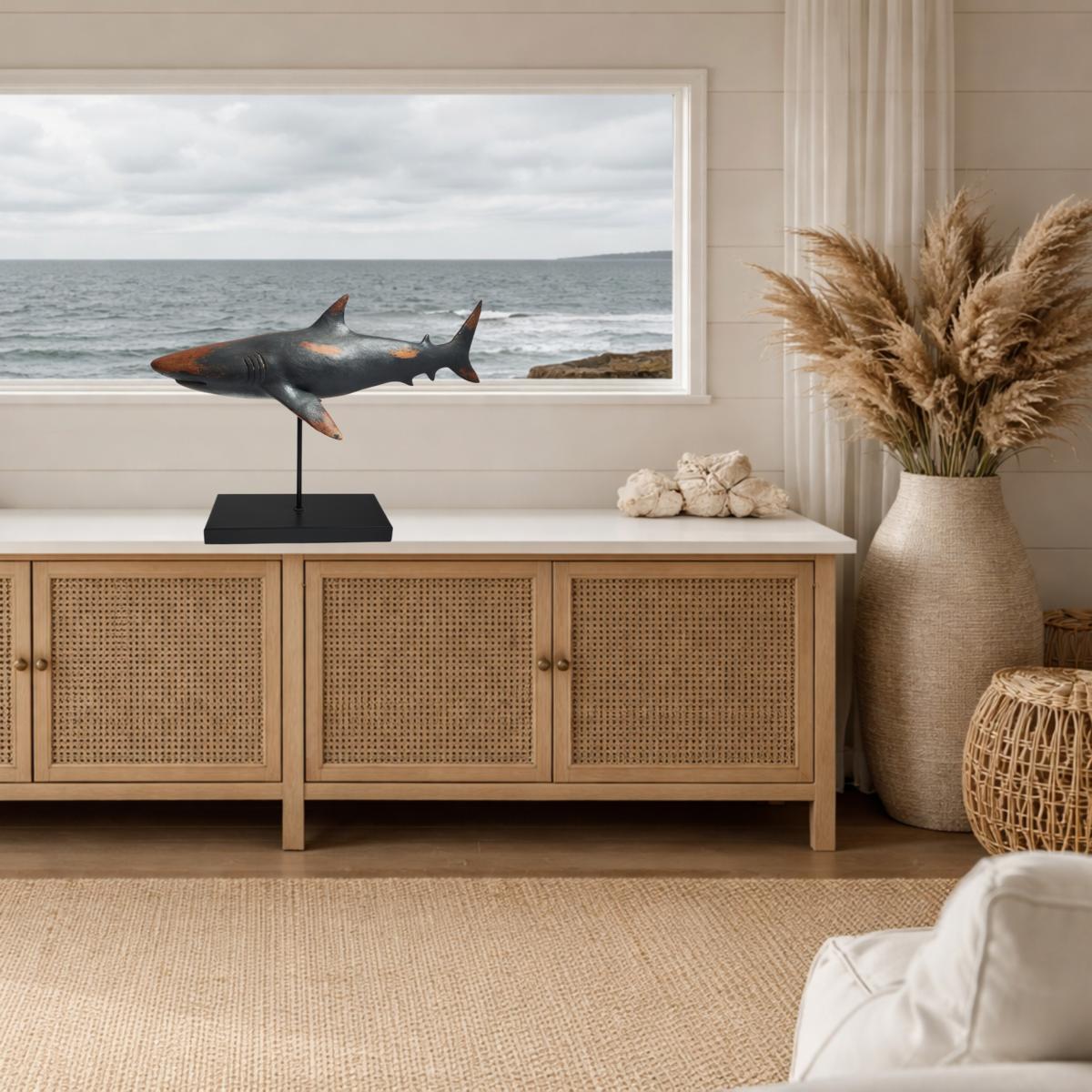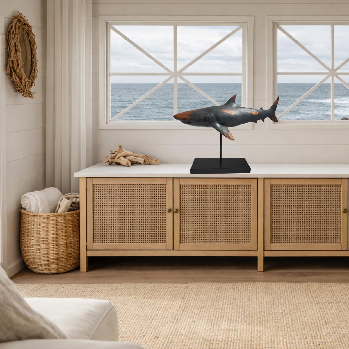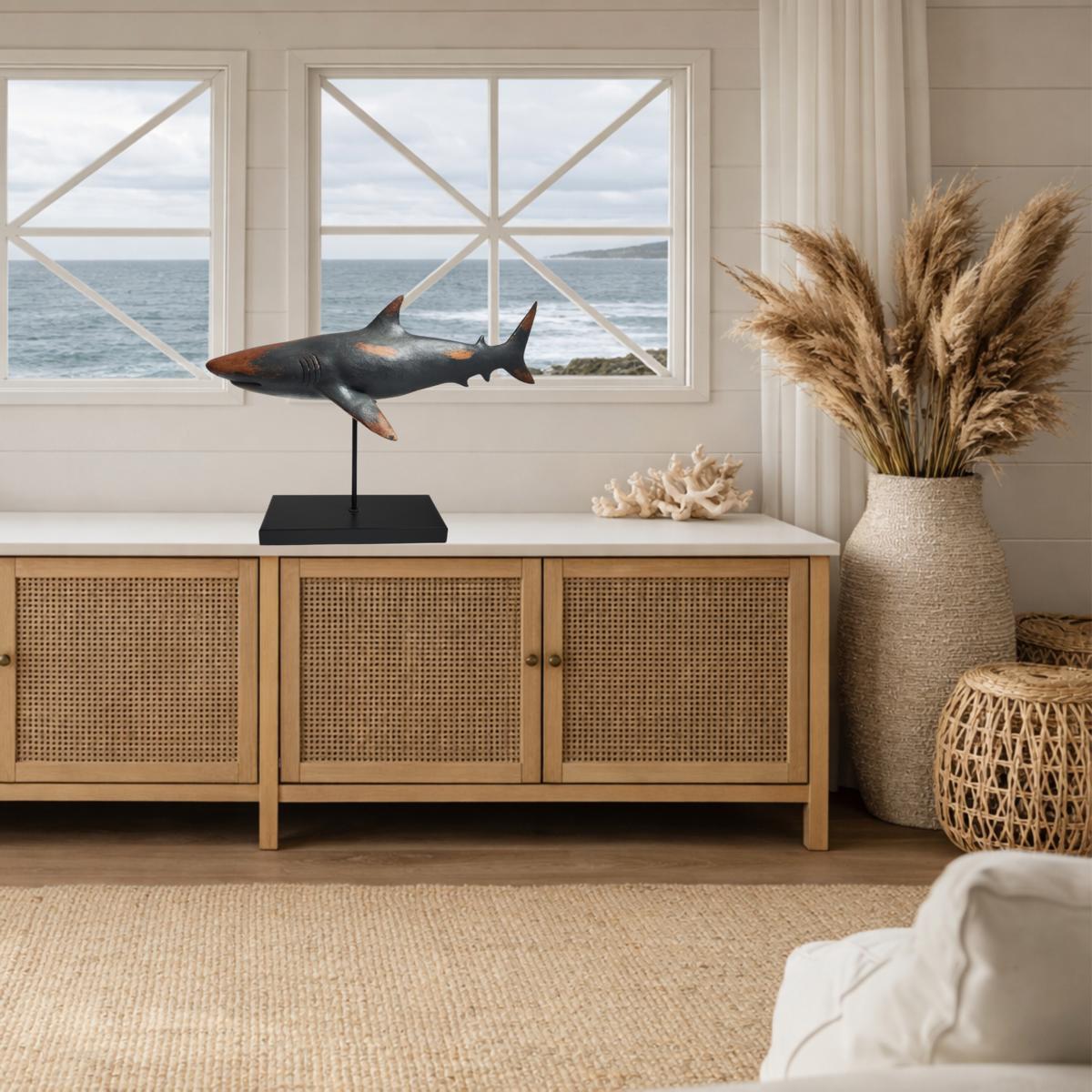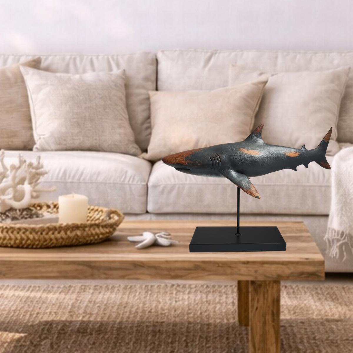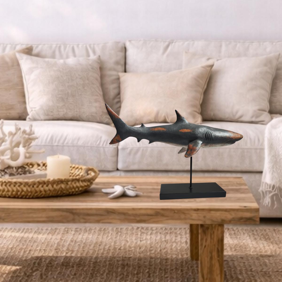 Eines der gefährlichsten und imposantesten Meerestiere der Welt lebt normalerweise in den blauen Weiten des Ozeans. Jetzt hast du die Möglichkeit, dir diesen atemberaubenden Meeresbewohner zu dir nach Hause zu holen. Diese wunderschöne Deko-Figur auf Standfuß aus Metall ist eine absolut ausgefallene Dekoration, mit der du garantiert für einen Hingucker in deinen vier Wänden sorgst. Der Hai aus Polyresin wurde sehr detailgetreu gefertigt und zu 100 % von Hand bemalt. Polyresin ist ein Kunstharz und sehr stabil. Der Standfuß des Hais besteht aus Metall und auf der Unterseite besitzt der Standfuß einen Kratzschutz. Der Hai macht sich sehr gut auf einer Kommode, Anrichte, auf einem Schreibtisch, oder auf der Fensterbank. Natürlich ist die Dekofigur nicht nur etwas für Fans der maritimen Einrichtung, sondern auch in einen modernen Wohnstil fügt sich der Hai harmonisch ein.