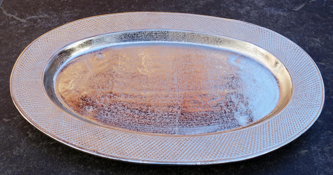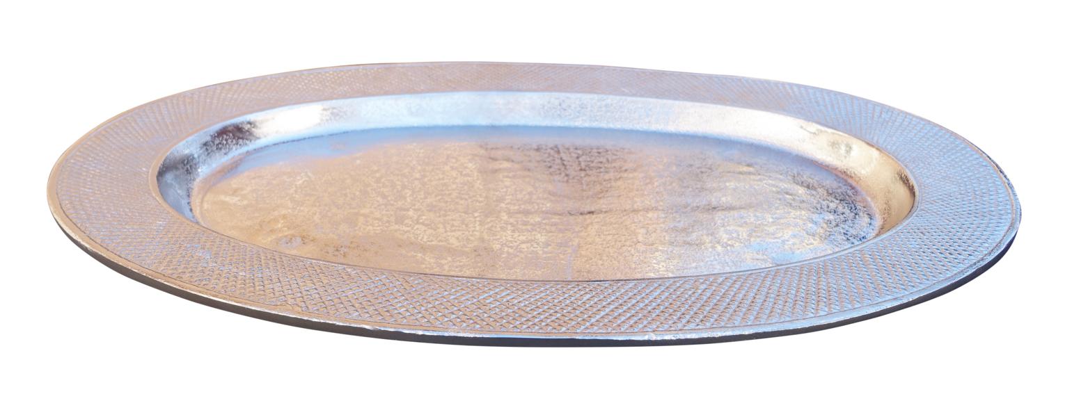 Die elegante Schale mit einer tollen und klassischen Randverzierung lässt jeden Tisch erstrahlen. Der Dekoteller lässt sich wunderbar in deine Wohnung integrieren. Der Dekoteller wurde handgefertigt und aus hochwertigem Aluminium in der Farbe silber hergestellt. Die Verzierung am Rand lässt den ovalen Teller besonders luxeriös wirken. Jeder Dekoteller ist durch seine Herstellung ein Unikat. Einsatzort der hochwertigen Ablageschale kann beliebig gewählt werden, z.B. im Wohnbereich, in der Küche, oder auch im Flur.