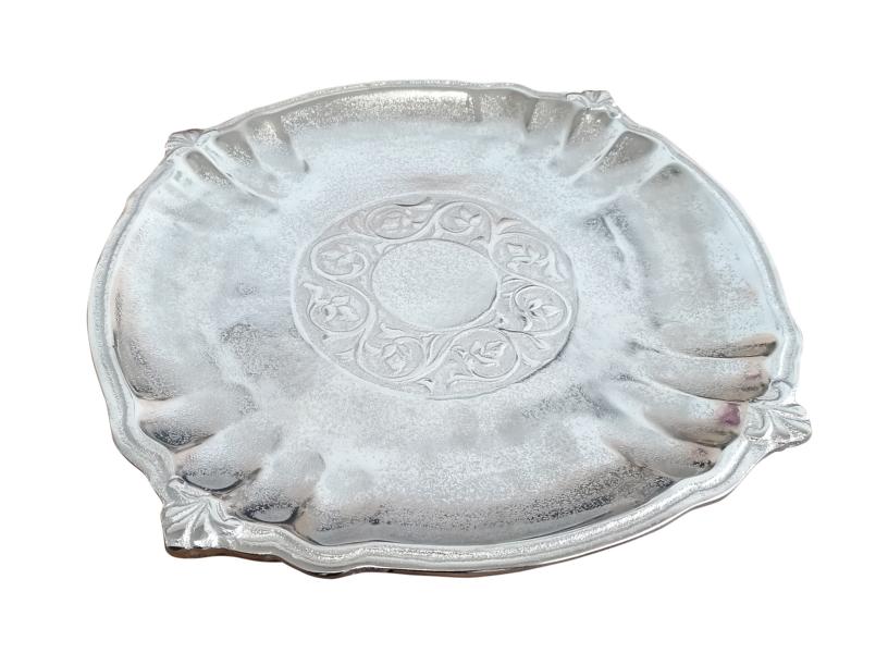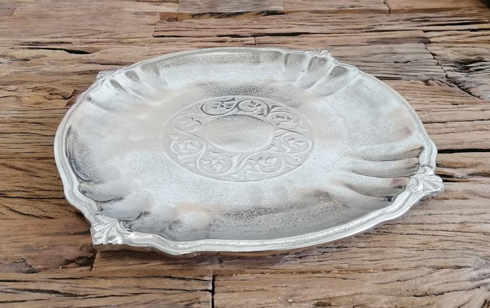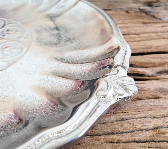 Elegante Dekoschale mit Ornamenten für dein Zuhause. Die Schale in der Farbe Silber lässt sich wunderbar in deine Wohnung und die Einrichtung integrieren. Gerade die Farbe Silber lässt sich nahezu in jeden Wohnstil integrieren und ist absolut zeitlos. Zusätzlich versprüht die Farbe Silber auch immer einen Hauch von Luxus und Eleganz. Die silberfarbene Schale lässt sich sehr gut in die Einrichtung einer modernen Wohnung, sowie in den klassischen oder eleganten Wohnstil einbinden. Die Silberschale lässt sich auch wunderbar im Eingangsbereich, auf dem Esstisch, oder im Wohnzimmer auf dem Couchtisch platzieren. Auch im Badezimmer kann die Schale wunderschön mit Sand und Muscheln dekoriert werden. Einsetzbar ist die Schale in Silber nahezu in jedem Raum deines Zuhauses. Bei der Dekoration kannst du deiner Phantasie freien Lauf lassen. Natürlich eignet sich die Schale auch als Geschenk für deine Liebsten und Freunde. Auch in der Gastronomie verschönert die Dekoschale garantiert das Ambiente. Sollte in naher Zukunft eine Hochzeit anstehen, dann kannst du diese Schale auch als Tischdeko und Blickfang nutzen. Die Schale wurde zu 100 % von Hand gefertigt und aus Aluminium (Metall) hergestellt. Jede der Schalen ist somit ein Unikat.
