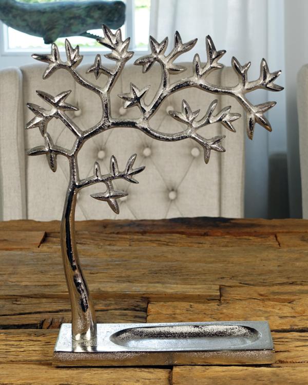 Schmuckbaum von Michael Noll Massiver und sehr hochwertig verarbeiteter Baum mit vielen Ästen zur Schmuckaufbewahrung Material: Aluminium Farbe: Silber Größe: 38x8x43 cm Der Schmuckbaum aus Aluminium (Metall) von Michael Noll lässt das Herz einer Frau erstrahlen. An den kleinen Ästen des silberfarbenen Schmuckständers lassen sich wunderbar deine Ketten, Ohrringe, oder Armbänder aufhängen. Der Baum kann nicht nur als Schmuckständer genutzt werden, sondern auch zur Dekoration als Dekobaum. Der Schmuckbaum ist 38x8x43 cm groß und bietet somit genug Platz für deinen Schmuck. Durch seine hochwertige und massive Verarbeitung versprüht der Schmuckständer das Gewisse etwas. Auf der Unterseite ist der Schmuckbaum mit einem Kratzschutz versehen. Auch als Geschenk ist der Schmuckbaum sehr gut geeignet, denn jede Frau hat Schmuck und benötigt eine passende Aufbewahrung dafür. Das Design und die Farbe Silber machen den Schmuckständer absolut zeitlos, so dass du dich viele Jahre daran erfreuen kannst. Zusätzlich lässt sich der silberfarbene Schmuckbaum in nahezu jeden Einrichtungsstil integrieren. Der Schmuckbaum aus Aluminium, eine Alternative zum Schmuckkästchen. Viele Jahre wurde der Schmuck gut behütet im Schmuckkasten aufbewahrt. Mit dem silberfarbenen Schmuckbaum gibt es eine übersichtlichere und dekorativere Variante. Der Schmuck ist nun nicht mehr in einer dunklen Schublade verstaut, sondern du kannst dich jeden Tag aufs neu an ihm erfreuen, da dir der Schmuck jederzeit ins Auge fällt. Der dekorative Baum ist der perfekte Aufbewahrungshelfer für deine Kostbarkeiten und deinen Schmuck. Dadurch das dein Schmuck nicht jeden Tag im Schmuckasten versteckt ist und dir der Schmuckbaum eine gute Übersicht bietet, wirst du deinen Schmuck wahrscheinlich wesentlich häufiger tragen. Bei Michael Noll kannst du dir deinen Schmuckbaum ganz einfach online bestellen. In unserem Shop findest du auch noch weitere Designs. Z.B. einen kleinen Schmuckbaum, einen großen Schmuckbaum, einen XXL Schmuckbaum, oder einen Schmuckbaum mit Ablage.