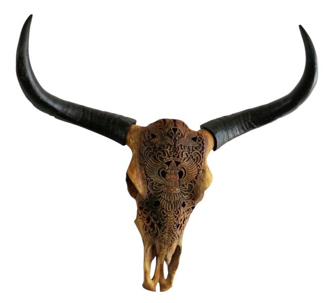 Der XXL Stierkopf als Wanddekoration ist ein absolutes Deko-Highlight. Aus stabilem Polyresin gefertigt, ist der XXL Bullenschädel ein Dekorationsobjekt für die Ewigkeit. Ob im Wohnzimmer, im Büro, oder auch im Schlafzimmer, an dieser exklusiven Wanddeko wirst du dich jeden Tag aufs Neue erfreuen können. Natürlich macht sich der schwere Stierkopf auch sehr gut in einer tollen Bar oder einem eleganten Restaurant. Beeindrucke mal wieder deine Gäste und Freunde mit einer ganz besonderen XXL Wanddeko. Der Deko-Schädel XXL wurde sehr detailreich gefertigt und verziert. Jeder Stierkopf wurde zu 100 % von Hand bemalt und ist somit ein Unikat. Der riesige Schädel besitzt zwei große und stabile Hörner. Dieser schwere Stierkopf mit seinen großen Hörnern ist ein schönes und individuelles Wohnaccessoire für die Ewigkeit. Durch das stabile Material Polyresin und das zeitlose Design, wirst du dich auch in vielen Jahren noch an deiner tollen Wanddeko erfreuen. Suchst du also eine ganz besondere Deko für dein Zuhause, dann bist du bei diesem tollen XXL Stierkopf zum Aufhängen fündig geworden. Denn ab sofort hängt nicht nur ein einfaches Bild, oder ein Spiegel an deiner Wand, sondern ein riesiger Stierkopf mit einem sehr lebensechtem Design. Und das Beste, für diese ganz besondere Wanddekoration musste kein Tier sein Leben lassen. Der XXL Schädel lässt sich leicht mit einer Schraube an der Wand befestigen. Bitte achte bei dem hohen Eigengewicht auf eine gute Befestigung für den XXL Stierkopf / Bullenkopf.