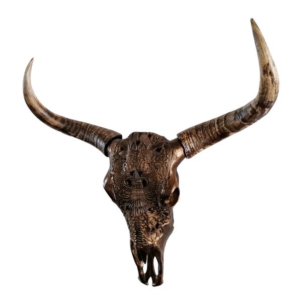 Der XXL Stierkopf als Wanddekoration ist ein absolutes Deko-Highlight. Aus stabilem Polyresin gefertigt, ist der XXL Bullenschädel ein Dekorationsobjekt für die Ewigkeit. Ob im Wohnzimmer, im Büro, oder auch im Schlafzimmer, an dieser exklusiven Wanddeko wirst du dich jeden Tag aufs Neue erfreuen können. Natürlich macht sich der schwere Stierkopf auch sehr gut in einer tollen Bar oder einem eleganten Restaurant. Beeindrucke mal wieder deine Gäste und Freunde mit einer ganz besonderen XXL Wanddeko. Der Deko-Schädel XXL wurde sehr detailreich gefertigt und verziert. Jeder Stierkopf wurde zu 100 % von Hand bemalt und ist somit ein Unikat. Der riesige Schädel besitzt zwei große und stabile Hörner. Dieser schwere Stierkopf mit seinen großen Hörnern ist ein schönes und individuelles Wohnaccessoire für die Ewigkeit. Durch das stabile Material Polyresin und das zeitlose Design, wirst du dich auch in vielen Jahren noch an deiner tollen Wanddeko erfreuen. Suchst du also eine ganz besondere Deko für dein Zuhause, dann bist du bei diesem tollen XXL Stierkopf zum Aufhängen fündig geworden. Denn ab sofort hängt nicht nur ein einfaches Bild, oder ein Spiegel an deiner Wand, sondern ein riesiger Stierkopf mit einem sehr lebensechtem Design. Und das Beste, für diese ganz besondere Wanddekoration musste kein Tier sein Leben lassen. Der XXL Schädel lässt sich leicht mit einer Schraube an der Wand befestigen. Bitte achte bei dem hohen Eigengewicht auf eine gute Befestigung für den XXL Stierkopf / Bullenkopf.