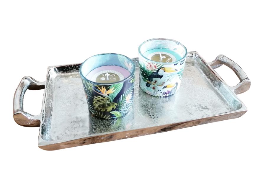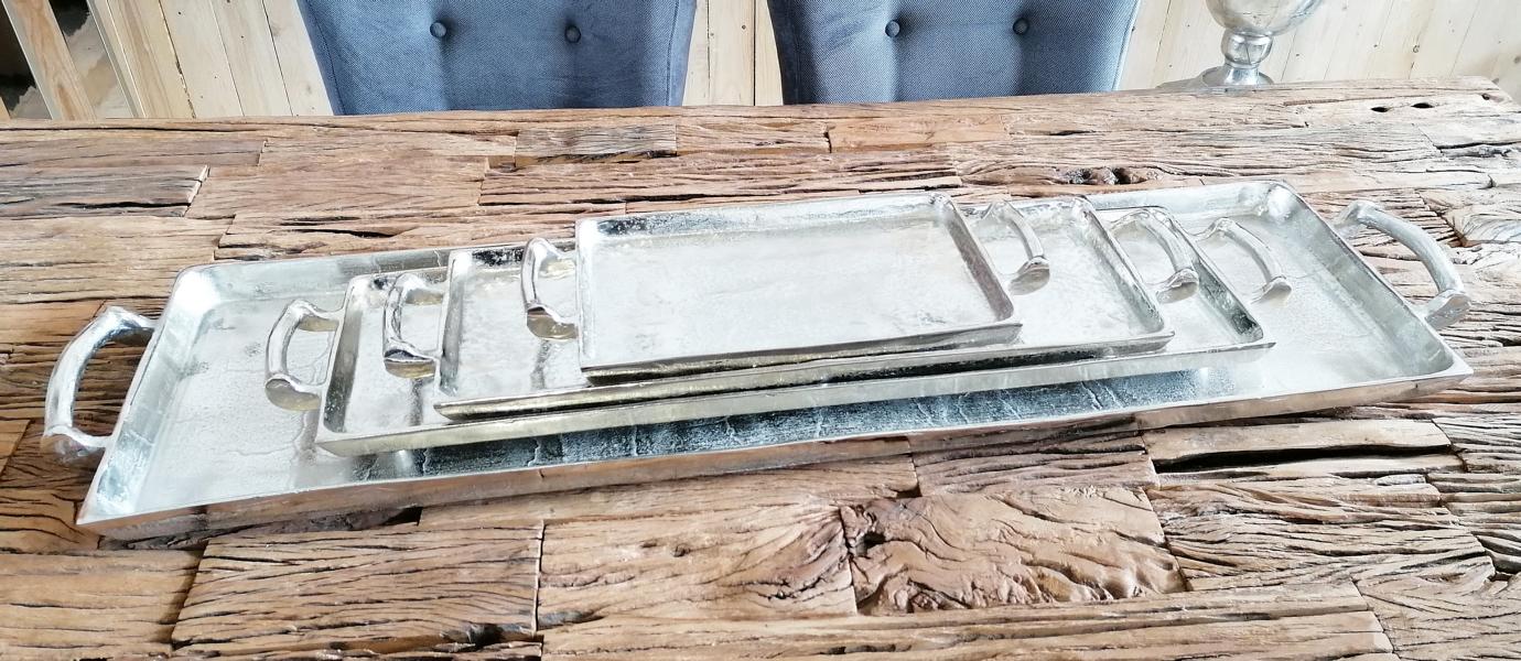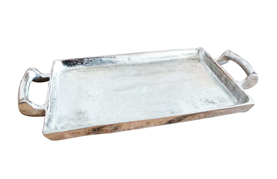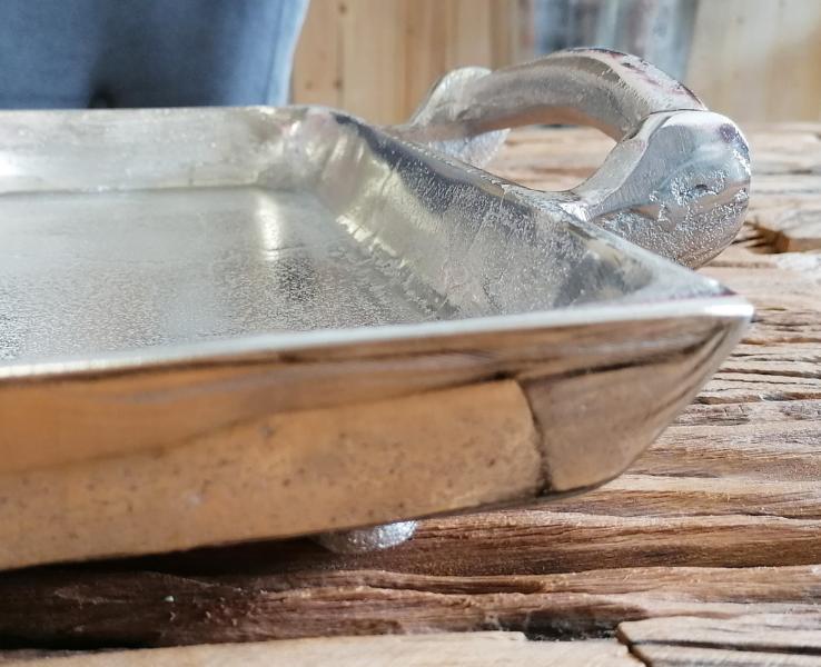 Edles und elegantes Tablett aus schwerem Aluminium (Metall). Der Werkstoff Aluminium ist äußerst robust und somit ist dieses Tablett ein Deko-Objekt für die Ewigkeit. Das exklusive silberfarbene Tablett lässt sich wunderbar in die Dekoration deiner Wohnung integrieren. Gerade die Farbe Silber ist absolut zeitlos und wirkt sehr luxuriös. Die beiden seitlichen Griffe sorgen für einen sicheren Transport des Tabletts. Das Tablett steht auf 4 Standfüßen. Auch zur Dekoration auf dem Tisch oder einem Sideboard eignet sich das Tablett hervorragend. Gerade auf einem großen Esstisch wirkt dieses Tablett sehr gut. Es kann mit Menagen, Kerzen, Teelichtern und Kunstblumen dekoriert werden. Jedes Tablett ist durch seine Herstellung in Handarbeit ein Unikat. Die Oberfläche des Tabletts ist in einer Raw-Optik gehalten. Das bedeute, dass die Oberfläche des Tabletts nicht poliert wurde. Jedes Tablett besitzt somit seine ganz eigene Oberflächenstruktur.