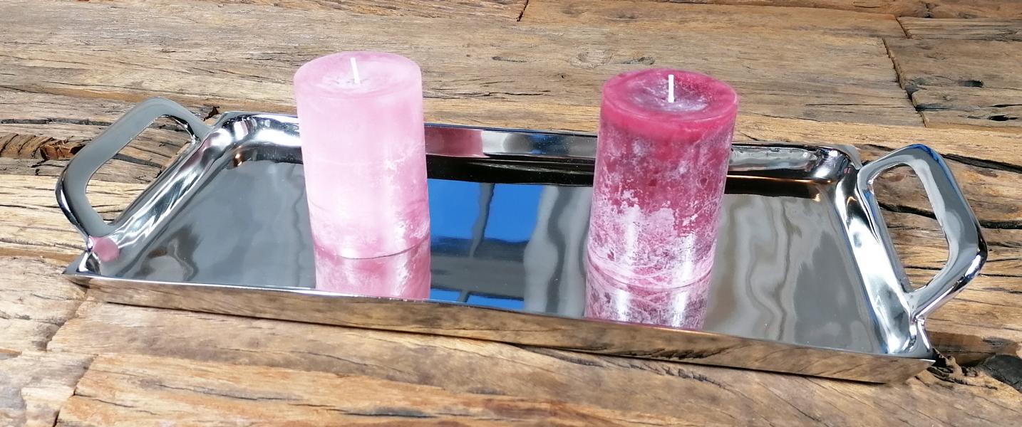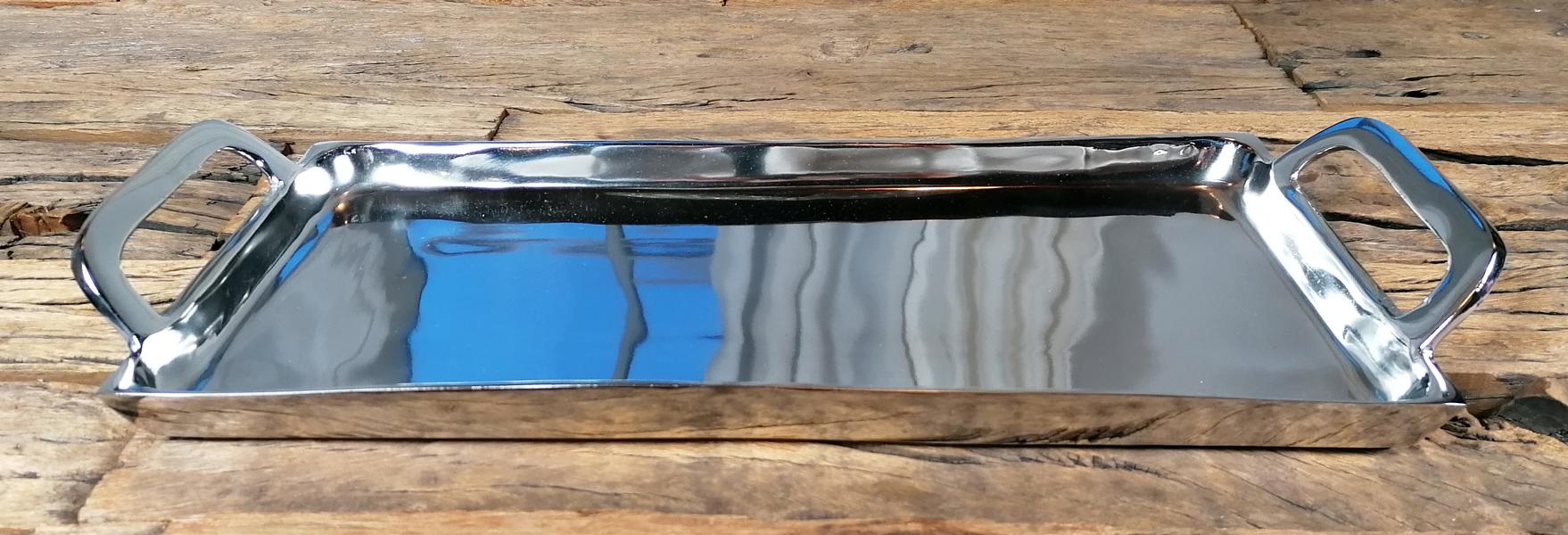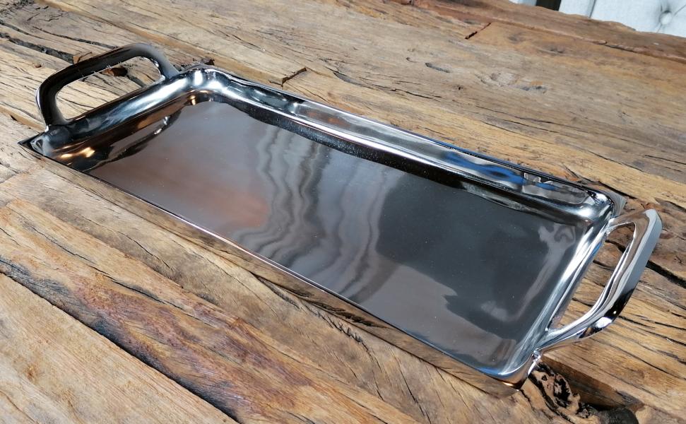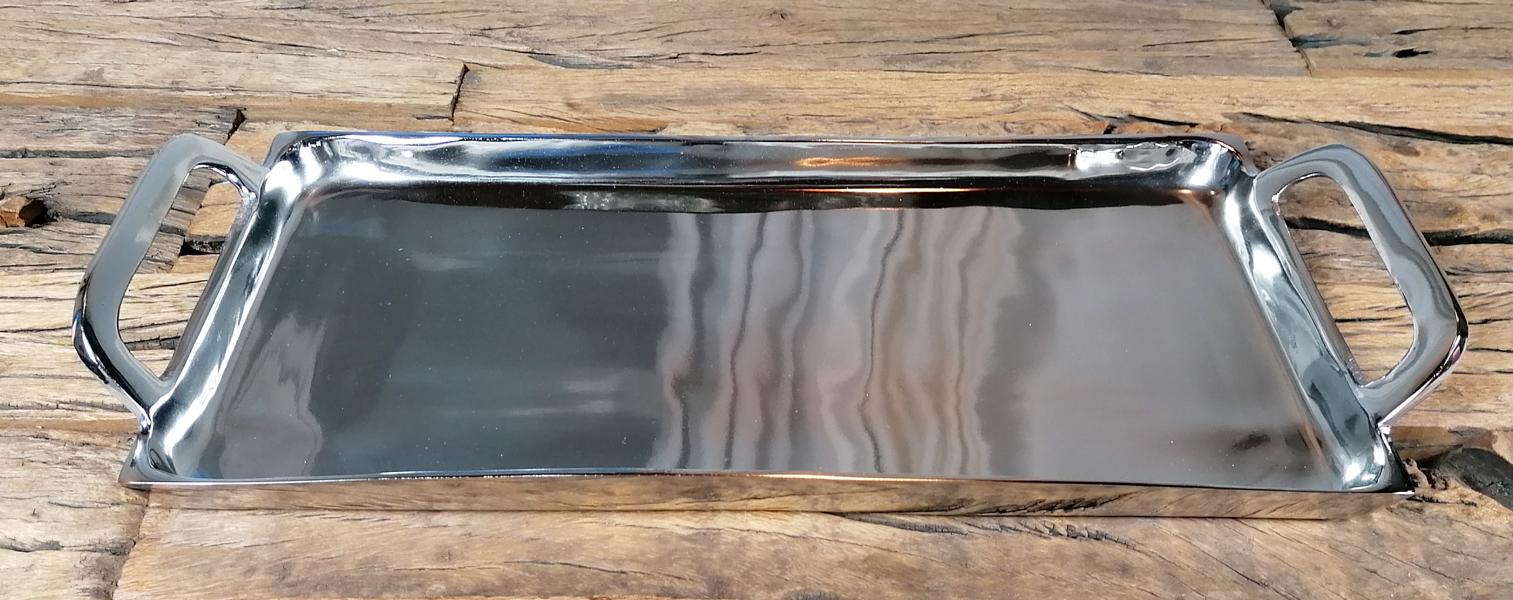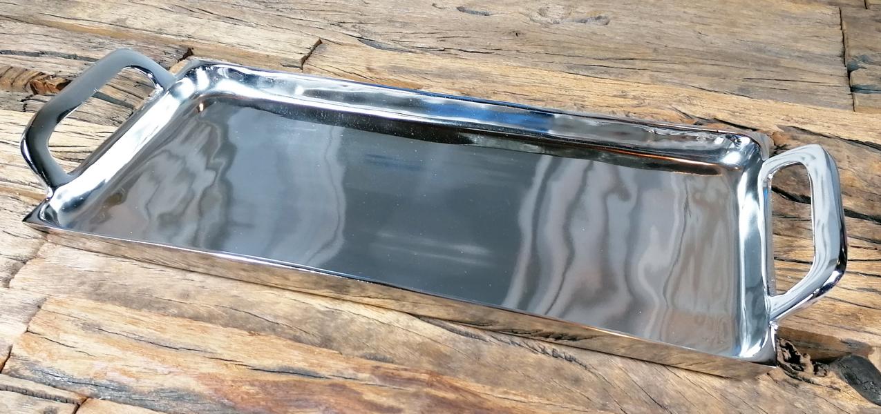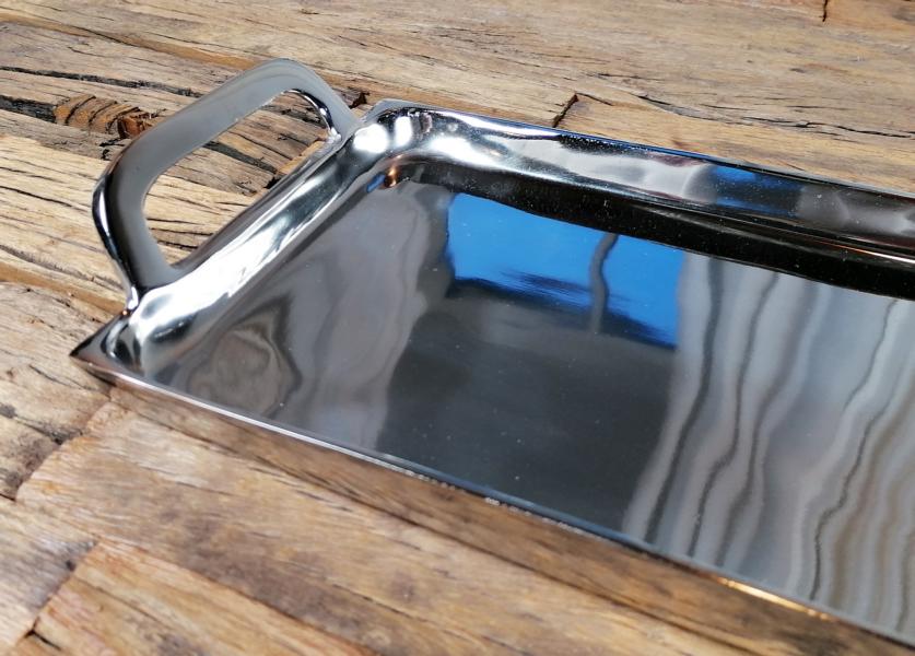 Silberfarbenes Tablett aus Aluminium (Metall) von Michael Noll. Das Tablett in der Farbe Silber besitzt seitlich zwei Griffe, somit kann das Tablett auch voll bestückt sicher transportiert werden. Gerade die Farbe Silber lässt sich sehr gut in jeden Einrichtungsstil integrieren. Das Tablett wirkt sehr luxuriös und ist ganz sicher ein absolutes Deko-Highlight. Die Fertigung des Tabletts ist zu 100 % von Hand erfolgt und wurde mit viel Leidenschaft ausgeführt. Die Oberfläche des Tabletts ist poliert, Dieses Tablett ist das perfekte Wohnaccessoire und lässt sich wunderbar in dein gemütliches Zuhause integrieren. Natürlich ist das polierte Deko-Tablett auch perfekt für die Gastronomie, ein Restaurant, oder eine Bar geeignet. Dekoriert werden kann das Tablett zum Beispiel mit schönen Kerzen, Salzstreuern oder anderer Dekoration. Deine Gäste werden garantiert begeistert sein. Zusätzlich ist das Tablett sehr pflegeleicht und muss nur mal ab und zu mit einem trockenen Tuch, oder einem leicht angefeuchtetem Lappen gesäubert / poliert werden. Der Boden des Tabletts ist mit einer Filzunterlage und Schutz vor Kratzern versehen.
