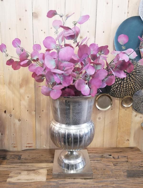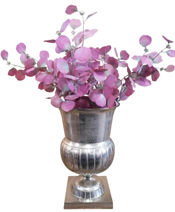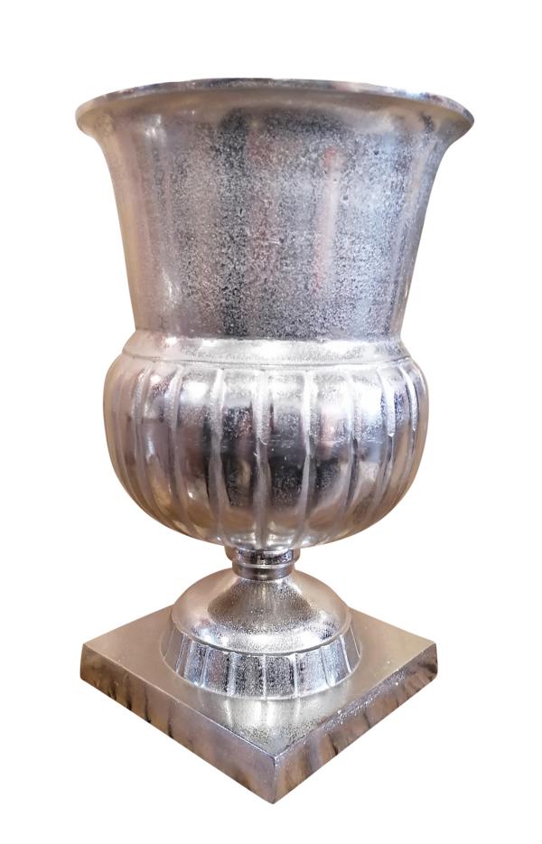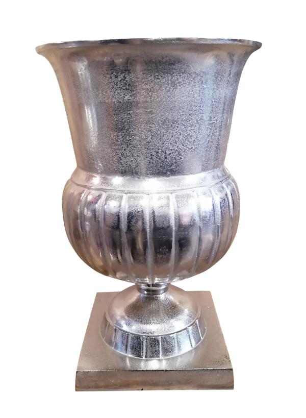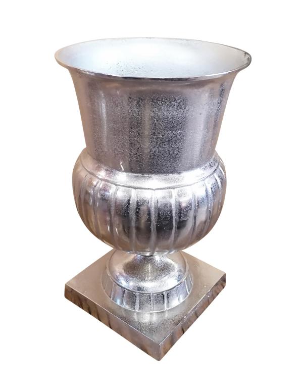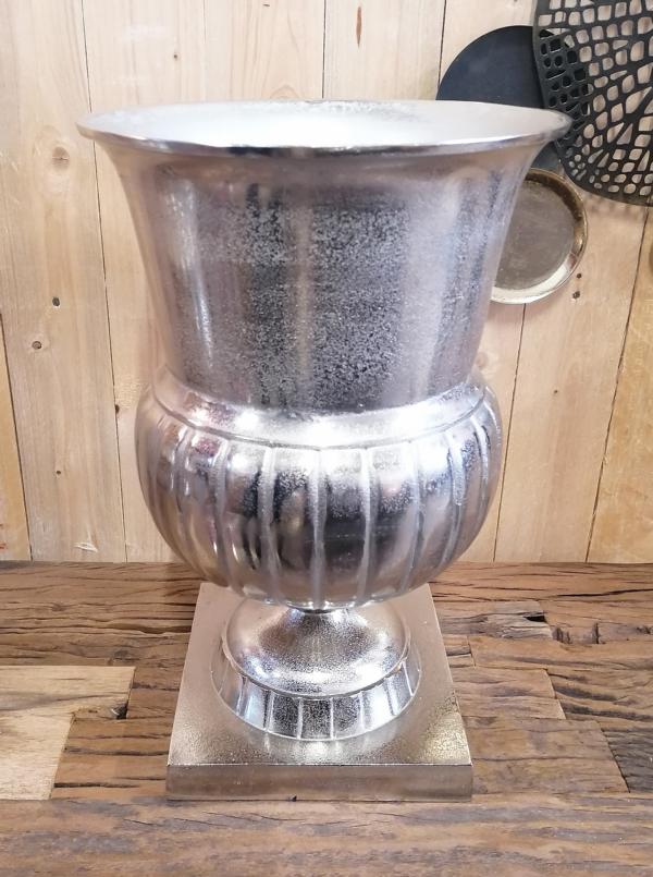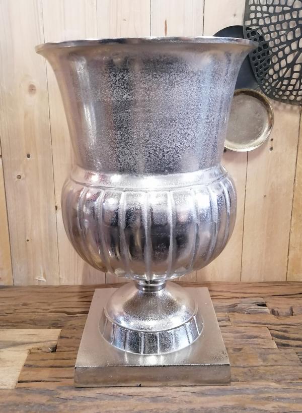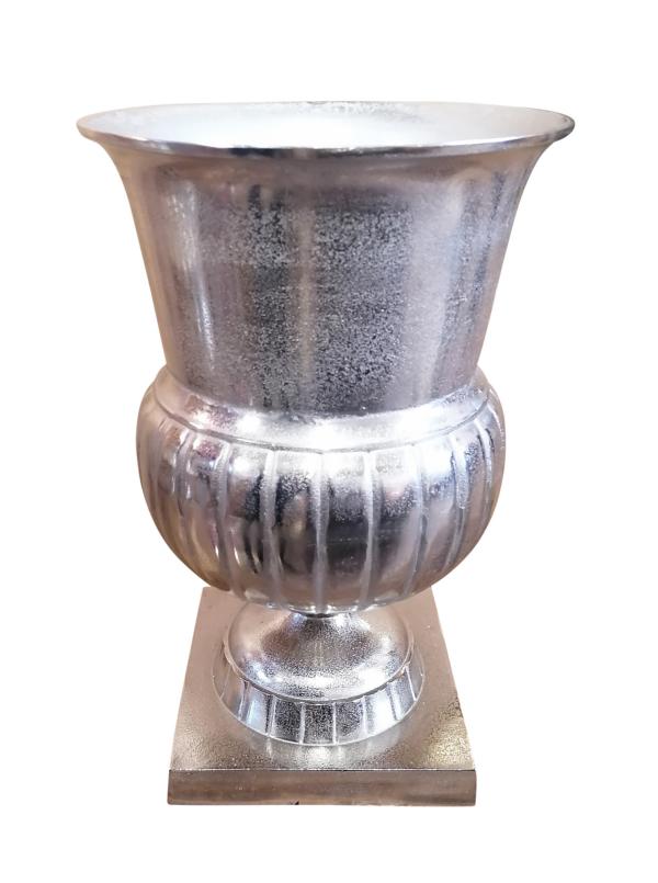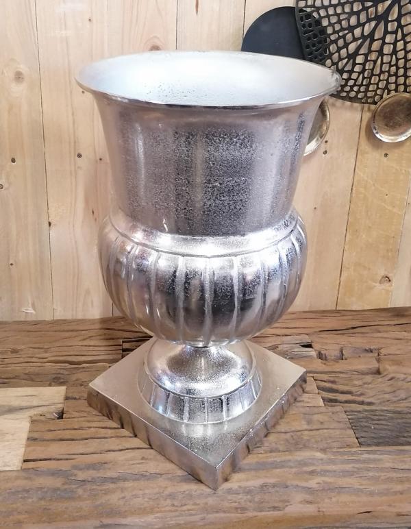 Elegante Vase aus Aluminium (Metall) in einer XL-Ausführung. Wenn du auf der Suche nach einer stilvollen, aber dennoch zeitlosen Vase bist, dann bist du hier ganz sicher fündig geworden. Die elegante silberne Vase mit ihrem bauchigen Mittelstück bildet dank der hochwertigen Aluminium-Beschichtung einen glänzenden Hingucker. Ob ohne oder mit schmückenden Kunstblumen darin - diese Design Vase wird in jedem Fall zu einem edlen Eyecatcher in deinem Zuhause. Deine Freunde und Familie werden begeistert sein. Besonders schön wirkt diese Vase auf einem großen Sideboard, oder einer Dekosäule. Natürlich kann diese XL Vase auch als Bodevase genutzt werden. Die Silbervase lässt sich selbstverständlich auch wunderbar in das Ambiente eines Restaurants oder Hotels einbinden. Gerade die Farbe Silber ist absolut zeitlos und versprüht auch immer einen Hauch von Luxus und Eleganz. Außerdem lässt sich die Dekovase in silber auch in so gut wie jeden Wohnstil integrieren. Auf der Unterseite der Vase befindet sich ein Kratzschutz. Die Vase wurde zu 100 % von Hand gefertigt.