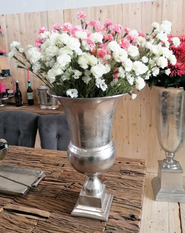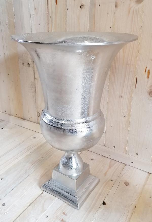 Diese wunderschöne Pokalvase ist zu 100 % von Hand aus massivem Aluminium gefertigt. Ihre Höhe beträgt 56 cm. Die silberne Vase ist garantiert ein Highlight in deinem Wohnbereich oder im Büro. Die Vase lässt sich sehr gut im Eingangsbereich, oder dem Wohnzimmer platzieren. Du kannst die Vase ganz individuell dekorieren, aber auch ganz ohne Dekoration sieht sie einfach nur klasse aus. Natürlich eignet sich diese silberfarbene Deko-Vase auch hervorragend zur Dekoration in der Gastronomie. Sie ist garantiert ein Blickfang in einer angesagten Bar, einem schicken Hotel oder einem eleganten Restaurant. Gerade die Farbe Silber ist sehr gut in jeden Wohnstil integrierbar und versprüht einen Hauch von Luxus und Eleganz. Die Oberfläche der Vase ist in einer Raw-Optik gehalten.