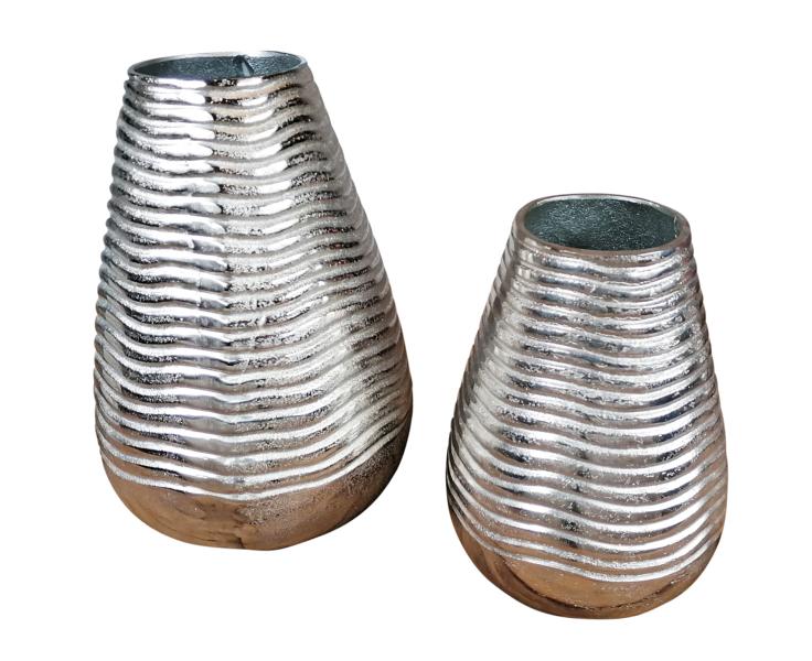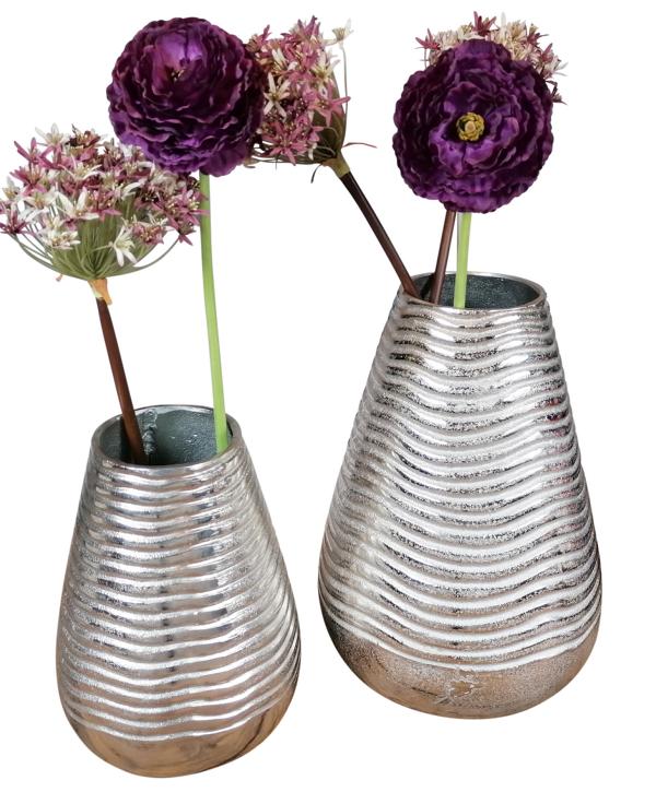 Vase Silber aus Aluminium in 2 verschiedenen Größen. Die runde Deko-Vase besteht aus massivem Aluminium und wurde zu 100 % von Hand gefertigt. Durch das hohe Eigengewicht stehen beide Vasen sehr stabil auf dem jeweiligen Untergrund. Ob einzeln oder im Duo, die Vasen wirken als wahres Deko-Highlight. Ob mit Kunstblumen, oder ganz ohne Blumen dekoriert, die Vase ist garantiert ein Blickfang in deinem Zuhause. Die Deko-Vase macht sich besonders gut im Eingangsbereich, dem Wohnzimmer, oder auch dem Büro. In der Gastronomie kann sie sehr gut in ein elegantes Ambiente eingebunden werden. In einer angesagten Bar, einem schicken Restaurant, oder einem hochklassigen Hotel, die silberfarbene Vase wertet jeden Raum auf. Gerade das Material Aluminium (Metall) macht diese Vase sehr langlebig. Die Farbe Silber ist absolut zeitlos, so dass du dich auch in vielen Jahren noch an deiner Vase erfreuen kannst. Außerdem lässt sich die Farbe Silber sehr gut in jeden Wohnstil integrieren. Ob Landhaus-Stil, moderne Einrichtung, oder eher klassisch, diese Vase lässt sich in jeden Wohnstil wunderbar einbinden. Die Oberfläche der Vase ist in einer schönen "Raw"-Optik gehalten. Das heißt, dass die Vase nach dem Guß nicht mehr poliert wurde und eine unbearbeitete Oberfläche besitzt. Die Vase sieht so wesentlich lebendiger aus und behält seine natürliche Oberflächenstruktur. Somit ist die XL Vase auch wesentlich pflegeleichter, da sie nicht poliert werden muss. Auf der Unterseite der Vase befindet sich ein Kratzschutz. Da die beiden Vasen in kompletter Handarbeit gefertigt wurden, kann es immer zu leichten Unregelmäßigkeiten kommen. Diese Unregelmäßigkeiten sind absolut gewollt.